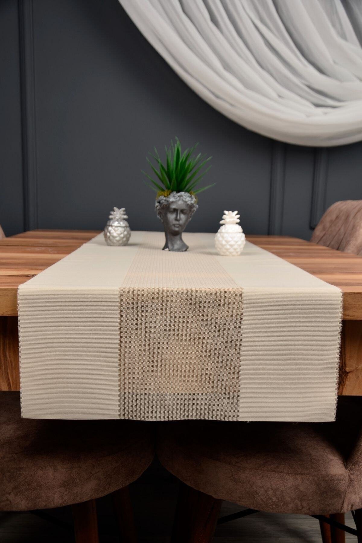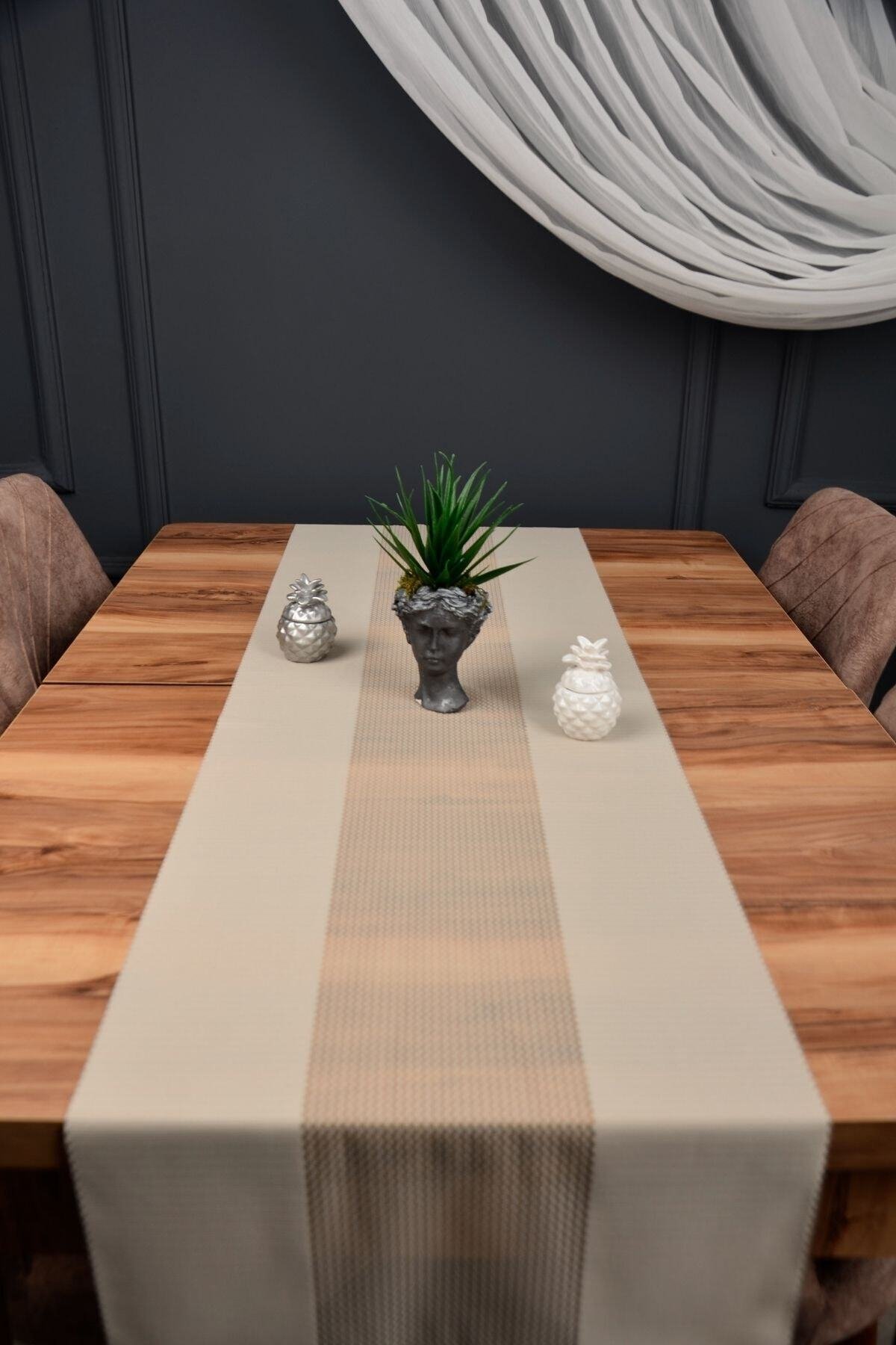 Sofralarınıza şıklık ve zarafet katacak runner masa örtüsü, modern tasarımı ve kullanışlı yapısıyla günlük kullanım ve özel davetler için idealdir.; Dayanıklı kumaşı sayesinde uzun ömürlü kullanım sunar, kolay temizlenebilir ve pratik bir şekilde kullanılabilir.; Ürün Özellikleri:• Ölçü: 40cm (en) x 140 cm (boy)• 30 derecede yıkanabilir.; • Ütülenebilir ve nemli bezle silinebilir.; • Leke çıkarıcı, yumuşatıcı ve çamaşır suyu kullanılmamalıdır.; Hem estetik görünümü hem de pratik temizleme imkânı ile sofralarınızı tamamlayan dekoratif bir parça olacaktır.
