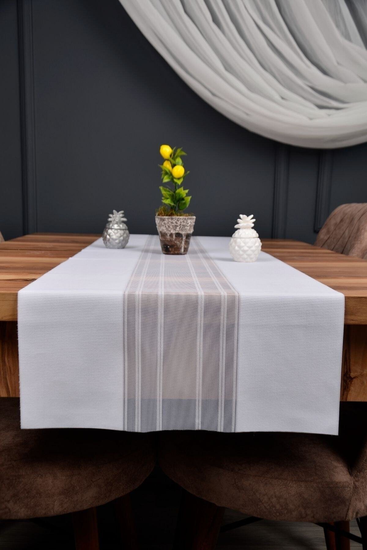 Sofralarınıza şıklık ve zarafet katacak runner masa örtüsü, modern tasarımı ve kullanışlı yapısıyla günlük kullanım ve özel davetler için idealdir.; Dayanıklı kumaşı sayesinde uzun ömürlü kullanım sunar, kolay temizlenebilir ve pratik bir şekilde kullanılabilir.; Ürün Özellikleri:• Ölçü: 40cm (en) x 140 cm (boy)• 30 derecede yıkanabilir.; • Ütülenebilir ve nemli bezle silinebilir.; • Leke çıkarıcı, yumuşatıcı ve çamaşır suyu kullanılmamalıdır.; Hem estetik görünümü hem de pratik temizleme imkânı ile sofralarınızı tamamlayan dekoratif bir parça olacaktır.