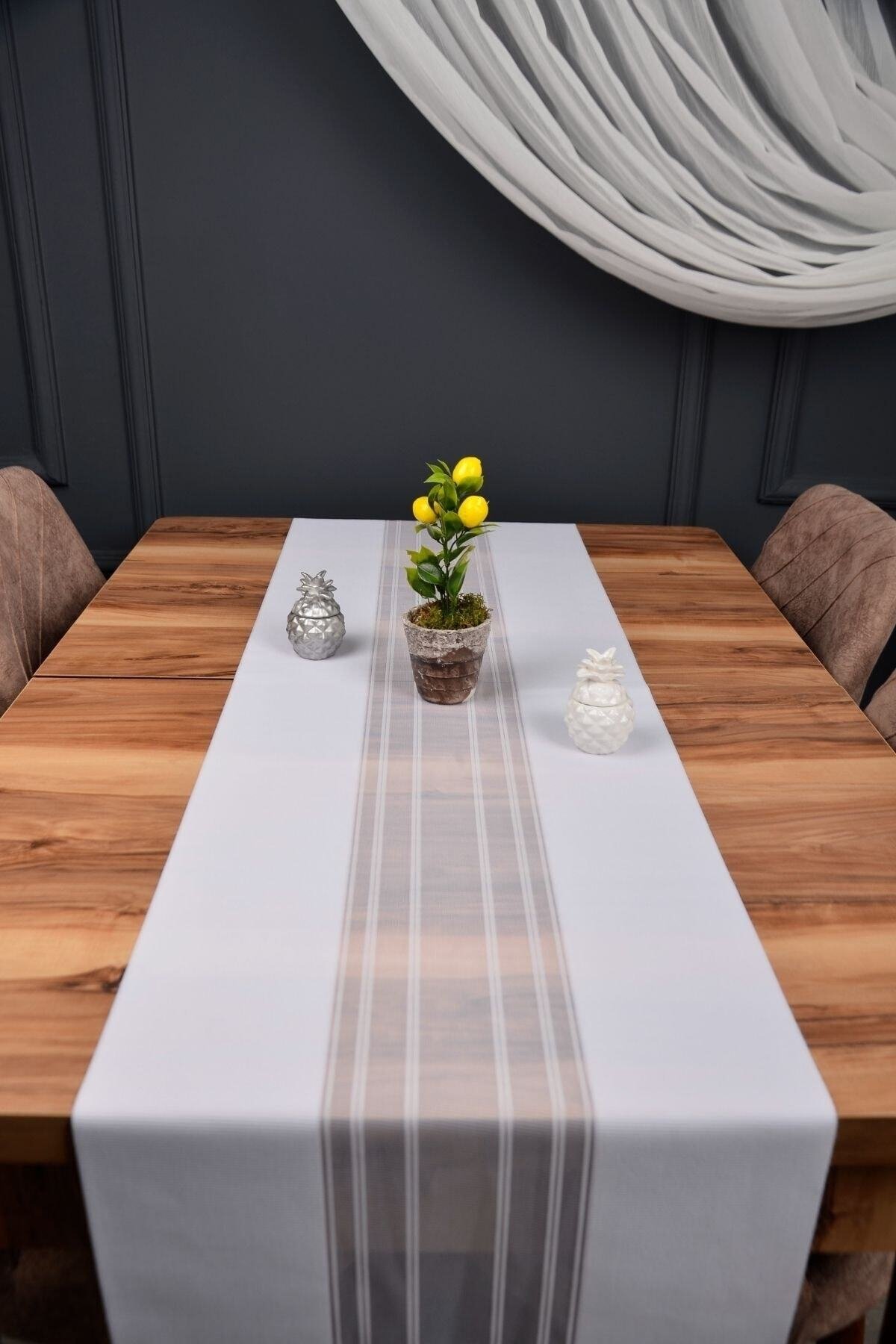 Beyaz Renk Çizgili Dekoratif Lazer Kesim Runner Masa Örtüsü 40 x 140