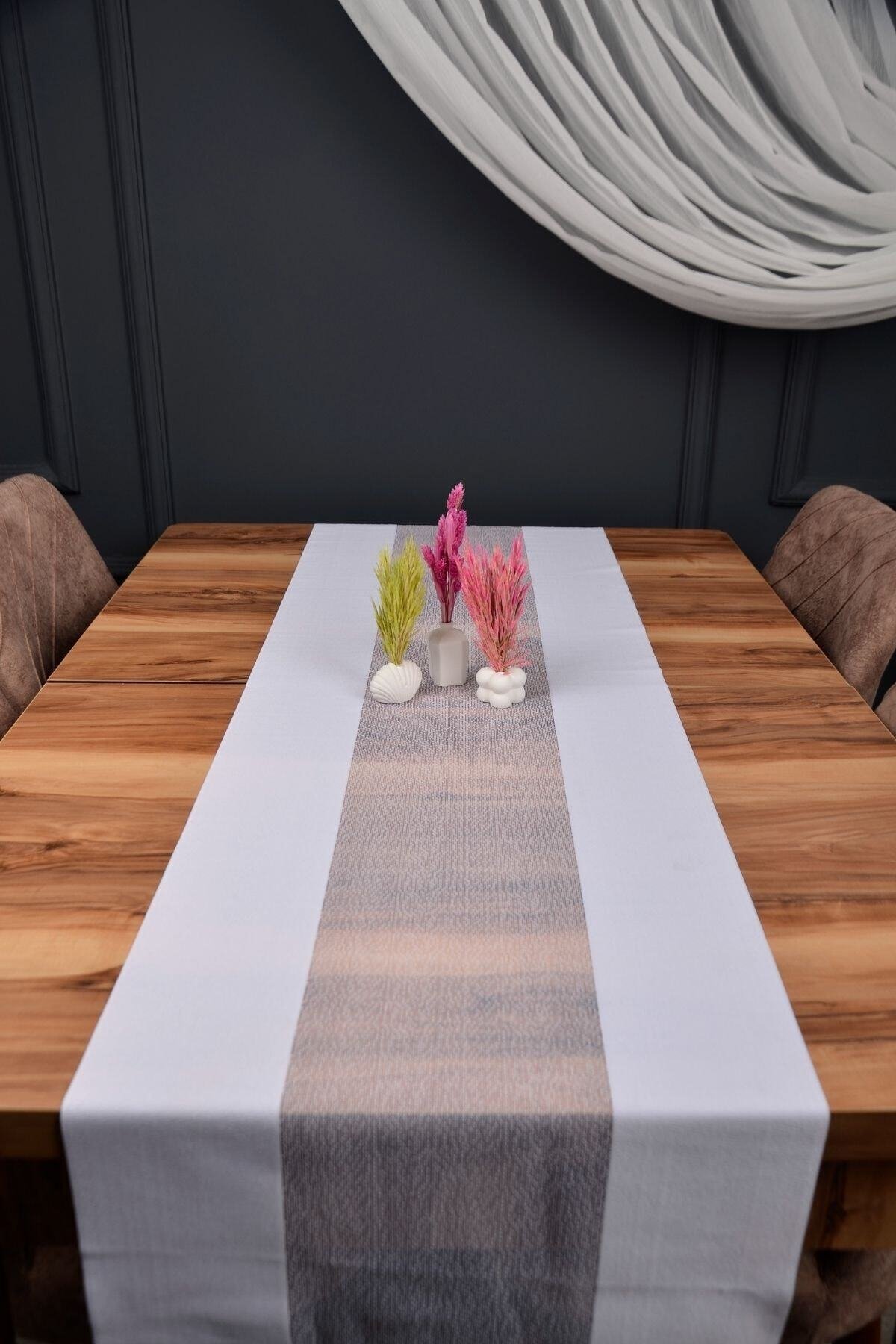 Sofralarınıza şıklık ve zarafet katacak runner masa örtüsü, modern tasarımı ve kullanışlı yapısıyla günlük kullanım ve özel davetler için idealdir.; Dayanıklı kumaşı sayesinde uzun ömürlü kullanım sunar, kolay temizlenebilir ve pratik bir şekilde kullanılabilir.; Ürün Özellikleri:• Ölçü: 40cm (en) x 140 cm (boy)• 30 derecede yıkanabilir.; • Ütülenebilir ve nemli bezle silinebilir.; • Leke çıkarıcı, yumuşatıcı ve çamaşır suyu kullanılmamalıdır.; Hem estetik görünümü hem de pratik temizleme imkânı ile sofralarınızı tamamlayan dekoratif bir parça olacaktır.