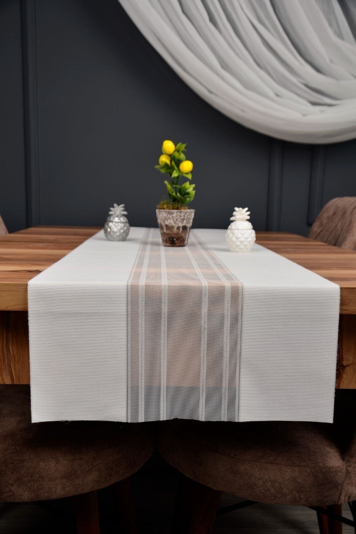Krem Renk Çizgili Dekoratif Lazer Kesim Runner Masa Örtüsü 40 x 140